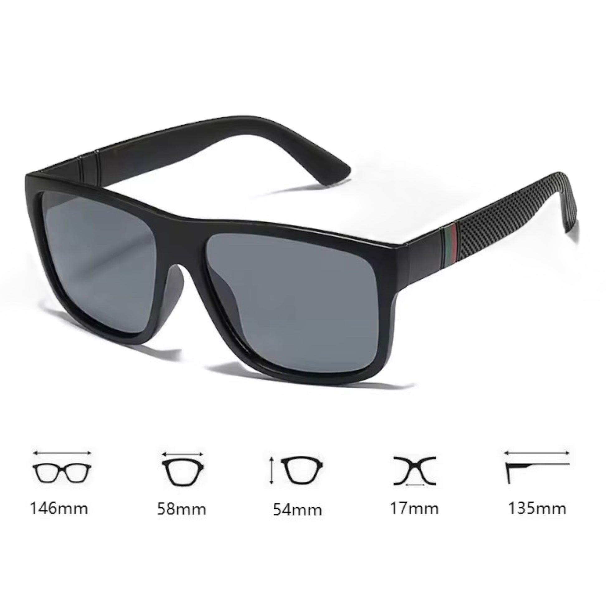 - Mål: Brillene har en bredde på 146 mm, linsehøyde på 58 mm, linsebredde på 54 mm, nesebro på 17 mm og stengelengde på 135 mm. Dette gjør dem ideelle for en rekke ansiktsformer og størrelser.